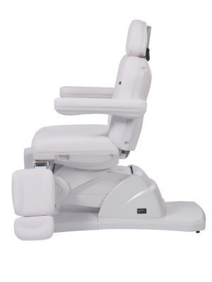 Visoka udobnost stolice za pedikuru TALUS, opremljena s 3 motora koji kontroliraju visinu, naslona i nagib sjedala. Nasloni za noge zakrenuti su do 90 ° i podesivi su u visinu hidrauličkim dizalom. Nasloni za ruke i podesivi naslon za glavu s otvorom za glavu. Ploče s gumbima ugrađene u naslon sjedala, naslona za glavu i sjedala omogućuju potpunu kontrolu svih funkcija iz bilo koje točke stolice. Presvlake od bijelog PU-a koje se lako čiste.