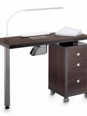 Stol za manikuru s usisavačem Artikl: 304 LX Gornja strana: melamin bijela, wengè Ormar: melamin, bijeli wengè Dimenzije: 115x50x79 cm Ventilator: AR2 35watt s filterom i vrećicom za prašinu Na zahtjev: AR5 aspirator od 60 W s filterom od aktivnog ugljena Priloženi dodaci: displej za lak za nokte, podloga za ruke, LED lampa sa 3 intenziteta svjetla, 12V, 700 lumena S kotačima