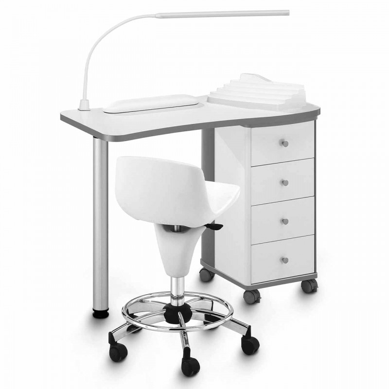 Funkcionalna i prostrana radna ploča stola za manikuru s dobro obrađenim metalnim sivim rubovima, AR1 ventilacijski sustav s ugljenim “dugotrajnim” filtrom (dostupan i s AR2 ili AR5 ventilacijskim sustavom) ormarići s 4 ladice, lakirana čelična noga s podesivom stopicom po visini. Stol također dolazi s LED svjetiljkom, naslonom za ruke i zaslonom za lak za nokte.